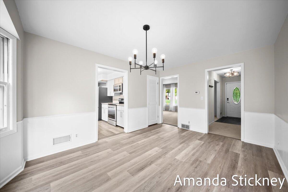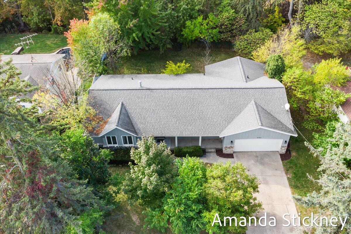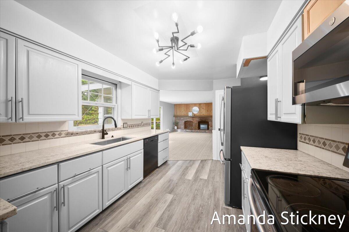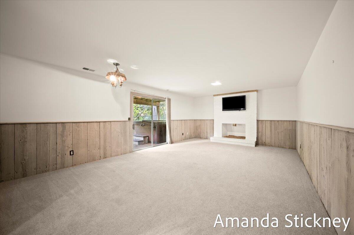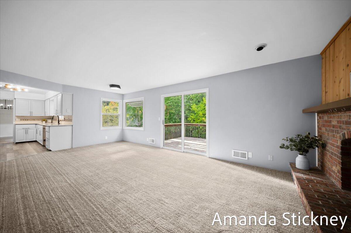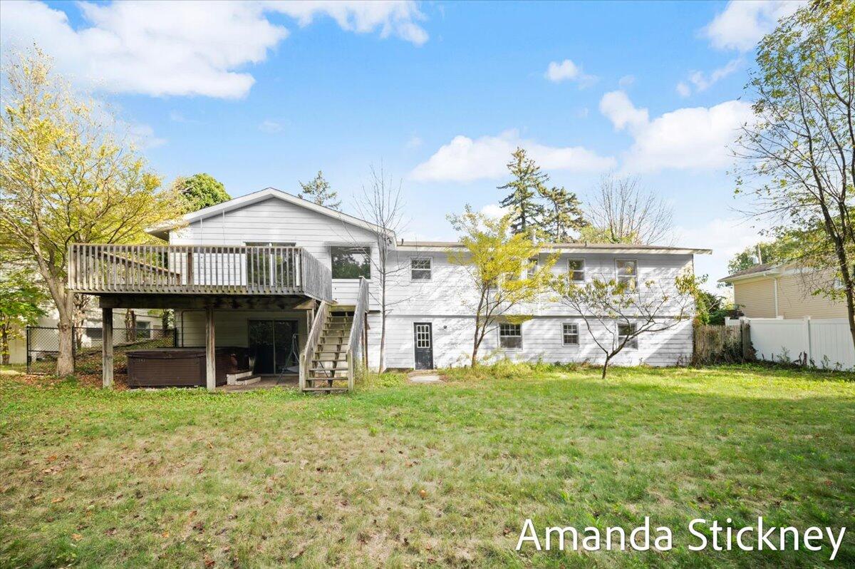 Welcome to your private retreat in Kentwood! This spacious walkout ranch combines comfort, style, and a peaceful setting perfect for entertaining or relaxing. The updated kitchen features quartz countertops, a large stainless farmhouse sink, maintenance-free flooring, refreshed cabinetry, and sleek stainless appliances. Host gatherings in the formal dining and living rooms with bay windows and built-in bookcase, or unwind by the cozy brick fireplace in the family room with sliders to the deck. The finished walkout level adds even more living space with a second fireplace, game or craft area with sliding barn door, and access to a private backyard oasis complete with hot tub and creek views. Thoughtful updates, generous space, and a tranquil atmosphere make this home truly special!